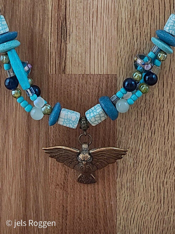 Deze ketting bestaat uit diverse handgemaakte glaskralen en is op een heel bijzondere manier geregen. Aan de ketting hangt een bronzen uil. De lengte van de ketting is ca 49 cm en is voorzien van een verlengketting voor 5 cm extra.