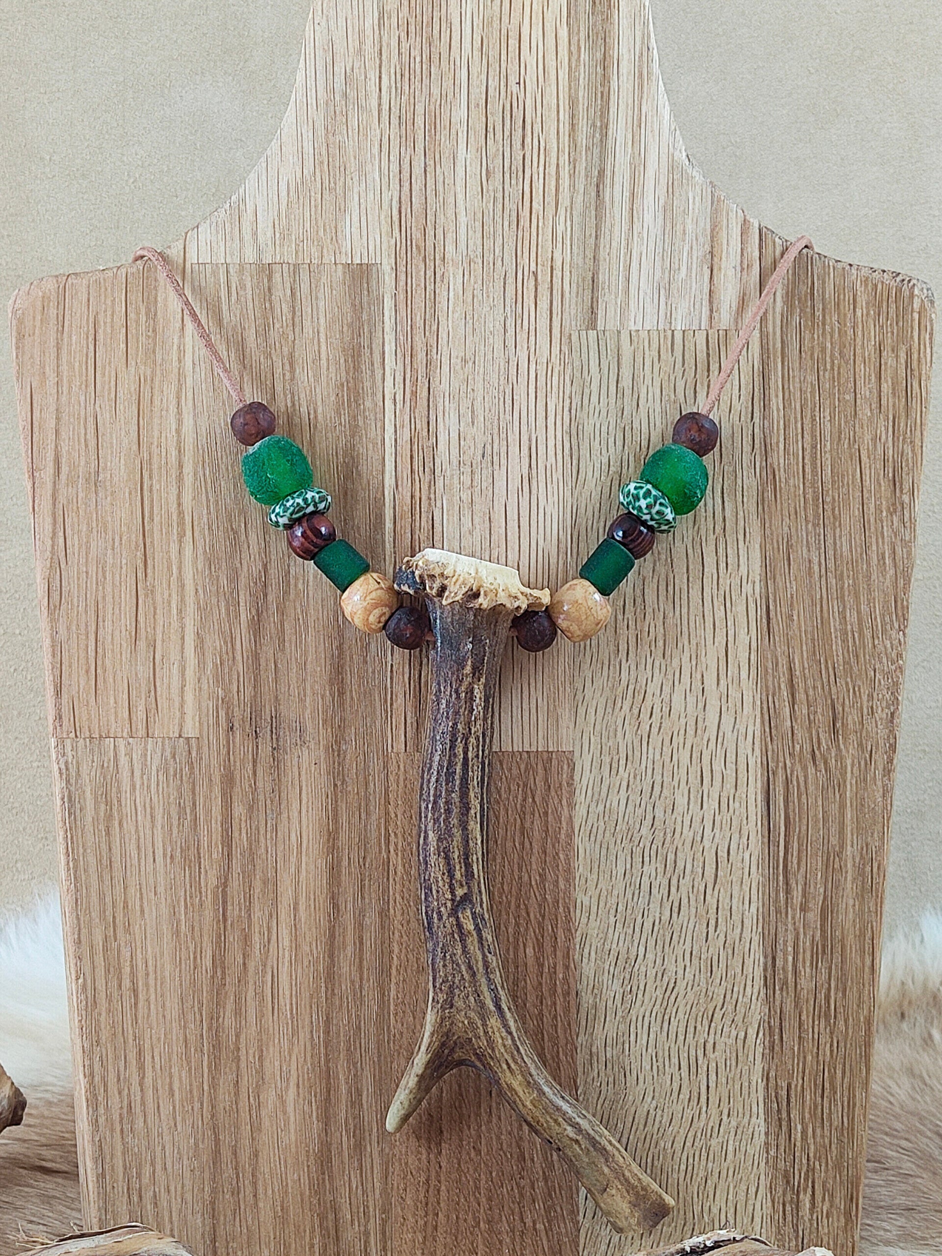 Deze ketting bestaat uit handgemaakte glaskralen, hout en gewei.