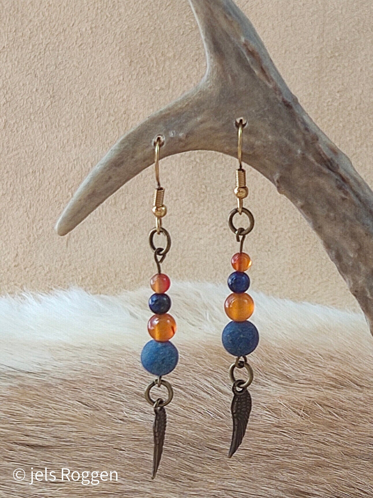 Blauwe Lapis Lazuli met oranje Carneool en een bronskleurige veer